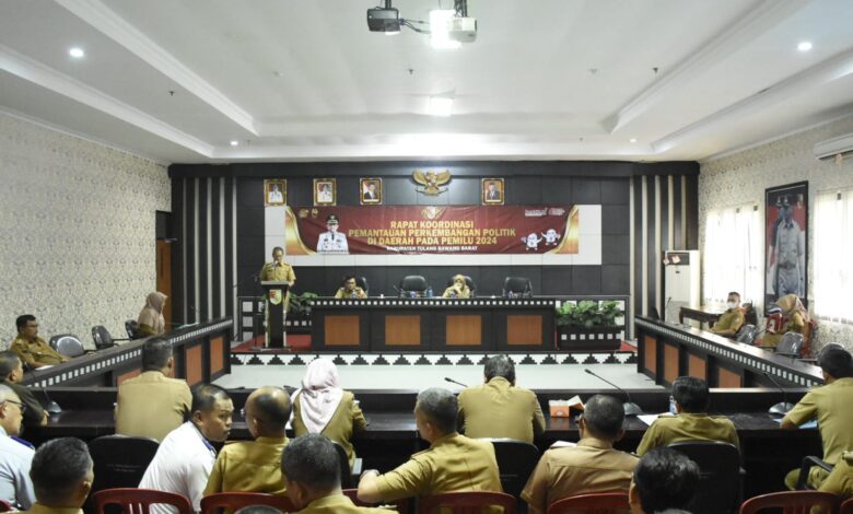Tulang Bawang Barat, MBL- Sekda Kabupaten Tulang Bawang Barat (Tubaba) Ir. Novriwan Jaya, SP saat membuka Rapat koordinasi (Rakor) Menyampaikan Pemantauan Perkembangan Politik di Daerah Pada Pemilihan Umum (Pemilu) 2024 yang berlangsung di Ruang Rapat Bupati. Senin (05/02/2024).
