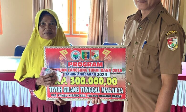 Tulang bawang barat, Mediaberitalampung.co.id- Pemerintah tiyuh (Desa) Gilang tunggal makarta kecamatan lambu kibang kabupaten tulang bawang barat, Salurkan bantuan langsung tunai (BLT) Kepada 7 keluarga penerima manfaat yang menggunakan dana desa (DD) pada tahap pertama tahun 2025.