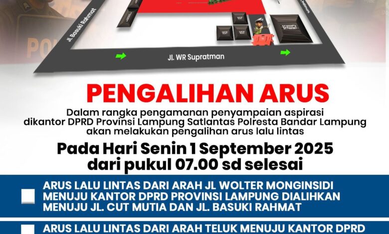 Lampung, Mediaberitalampung.co.id– Satuan Lalu Lintas (Satlantas) Polresta Bandar Lampung akan memberlakukan pengalihan arus lalu lintas pada Senin (1/9/2025) mulai pukul 07.00 WIB hingga selesai. Langkah ini dilakukan untuk mendukung kelancaran dan keamanan penyampaian aspirasi di Kantor DPRD Provinsi Lampung.