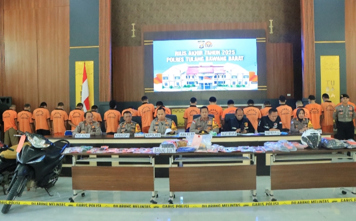 Tulang Bawang Barat-Polres Tulang Bawang Barat Polda Lampung Menggelar Rilis Akhir Tahun 2025 yang disampaikan langsung oleh Kapolres Tulang Bawang Barat AKBP Sendi Antoni, S.I.K., M.IK. dengan didampingi oleh Waka Polres, Kabag Ops, Kasat Reskrim, Kasat Narkoba, Kasat Lantas, Kasat Tahti, Kasi Propam, Kasi humas dan Para Kapolsek Jajaran Polres Tubaba, bertempat di Aula Sarja Arya Racana Pores Tulang Bawang Barat, Rabu (31/12/2025).