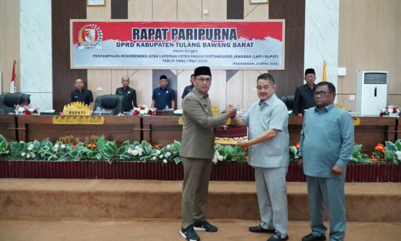 TULANG BAWANG BARAT -Dewan Perwakilan Rakyat Daerah (DPRD) Kabupaten Tulang Bawang Barat (Tubaba) Menggelar Rapat Paripuna  dalam Rangka Penyampaian rekomendasi atas Laporan Keterangan Pertanggungjawaban (LKPJ) Bupati Tahun Anggaran 2025, Kegiatan yang Berlangsung di Ruang Rapat Paripurna DPRD Tubaba, Senin (27/04/2026).