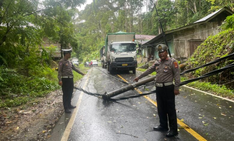 Sat Lantas Polres Pesisir Barat bantu evakuasi tiang listrik roboh yang memenuhi badan jalan